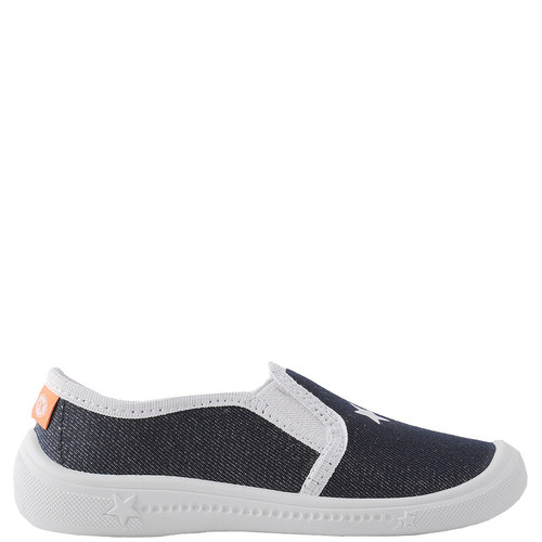 Детски текстилни обувки от памучен плат, който абсорбира влагата, подходящи за употреба в дома и навън, с ластик за бързо обуване и добро прикрепване. Противоплъзгащо дишащо ходило, задигнато в предната и задна част, за да защитава стъпалото. Не оставя следи върху подовите настилки и е износоустойчиво. Спортно-елегантен дизайн в тъмносиньо и бяло със загатнат проблясващ ефект.