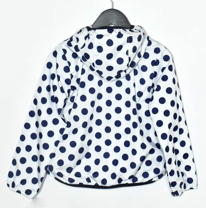 Тънко яке за момичета в бяло на тъмносини точици. Подходящо за сезон: пролет-есен. Якето е с качулка която не се сваля. Състав: 100% полиестер.Произведено в Турция.