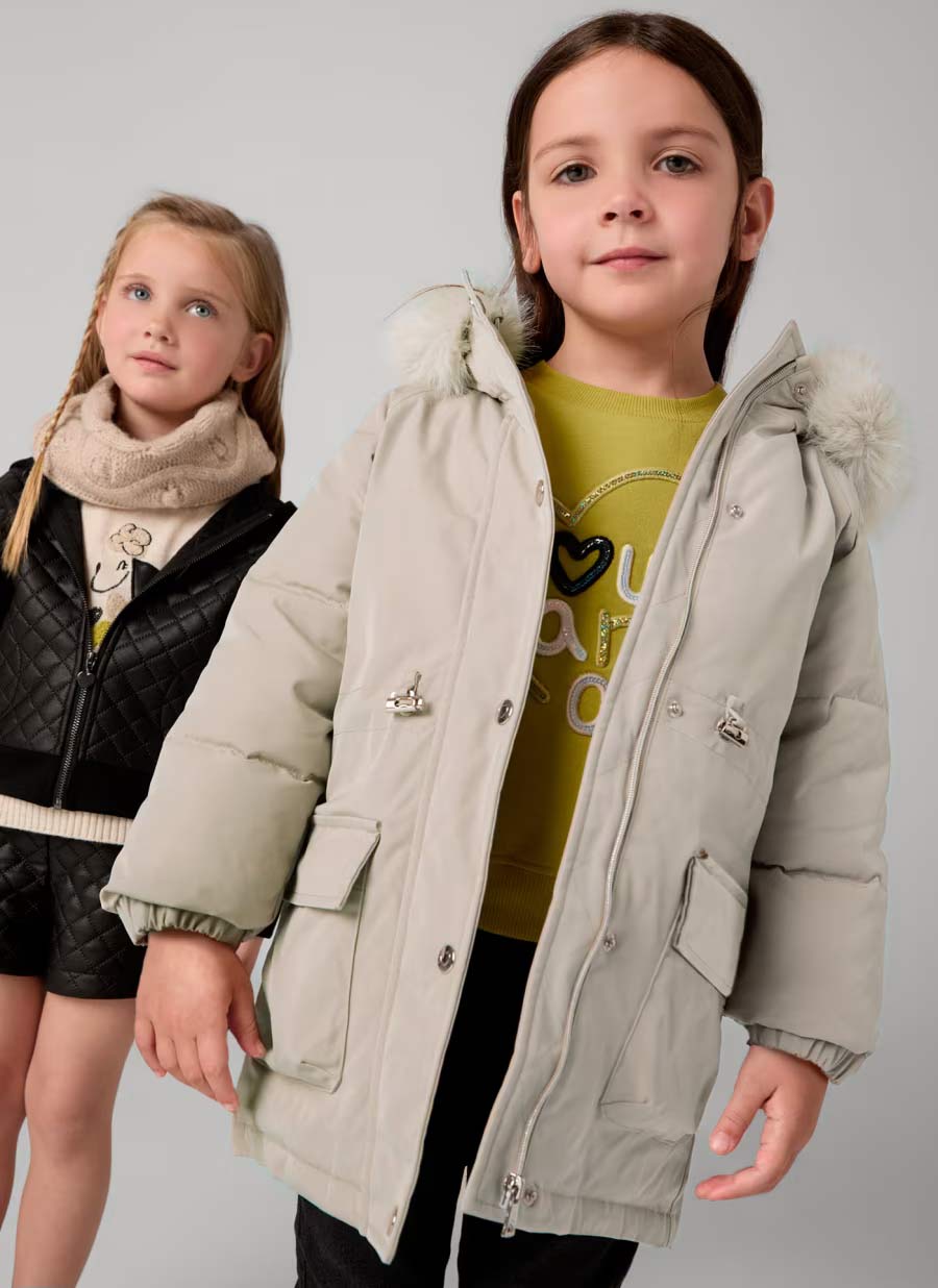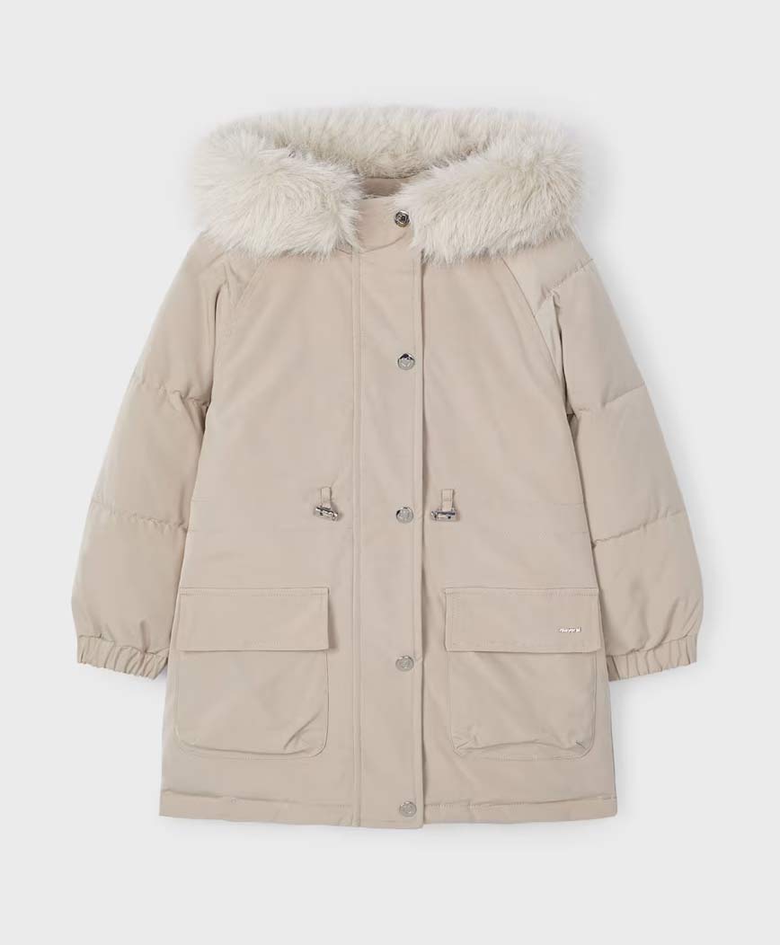 # Mayoral Шуба с дълъг ръкав за момиче. Фиксирана качулка с периферия с косъм, която се сваля. Лека, дишаща и много удобна тъкан.